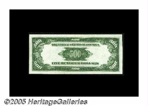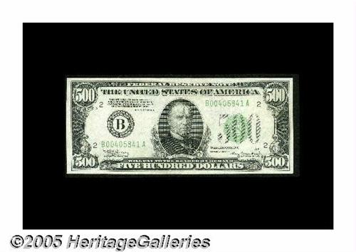 <B>Fr. 2202-B $500 1934A Federal Reserve Note. About Uncirculated.</B></I><BR>A bright and nicely centered example kept from a higher grade by a well-concealed center fold.