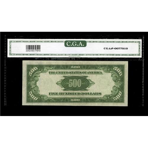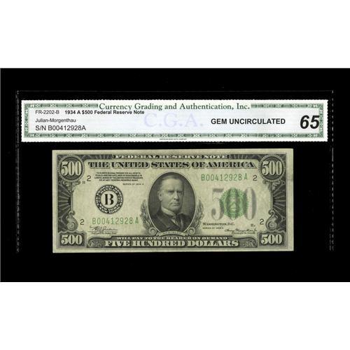 <B>Fr. 2202-B $500 1934A Federal Reserve Note. CGA Gem Uncirculated 65.</B></I><BR>A nice example for those wishing a certified $500 note.