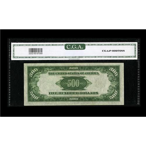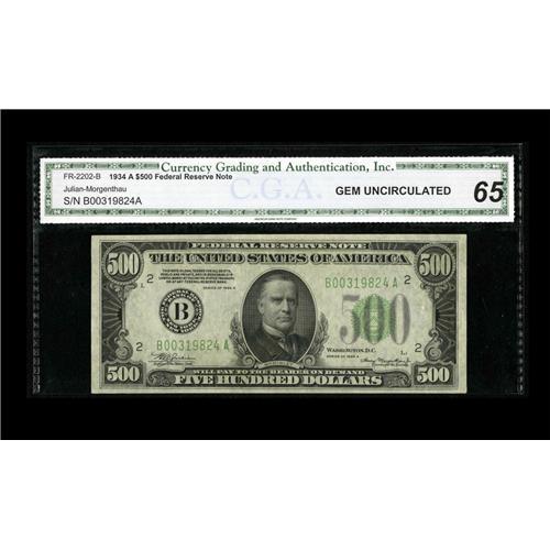 <B>Fr. 2202-B $500 1934A Federal Reserve Note. CGA Gem Uncirculated 65.</B></I><BR>Plenty of embossing is visible on this Big Apple $500.