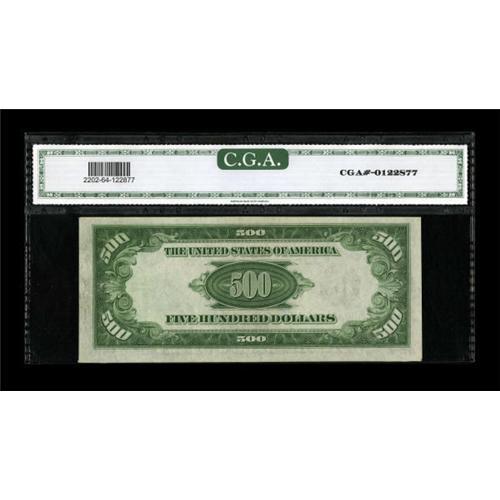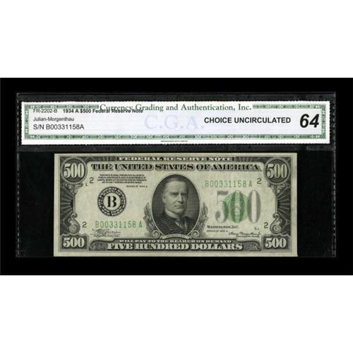 <B>Fr. 2202-B $500 1934A Federal Reserve Note. CGA Choice Uncirculated 64.</B></I><BR> Some serial number embossing is still visible on this pleasing example for type.<BR><BR><b>Shipping:</b> Coins & Currency (<a target="_blank" href="http://www.heritageauctions.com/common/shipping.php">view shipping information</a>)