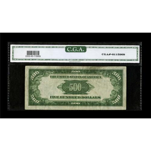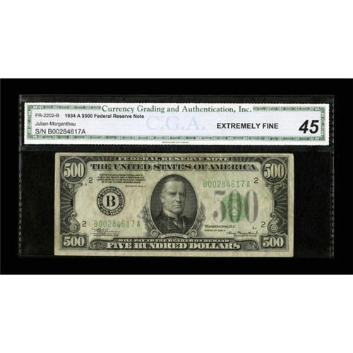 <B>Fr. 2202-B $500 1934A Federal Reserve Note. CGA Extremely Fine 45.</B></I><BR> Plenty of embossing can be seen on this lightly handled, solidly margined note.<BR><BR><b>Shipping:</b> Coins & Currency (<a target="_blank" href="http://www.heritageauctions.com/common/shipping.php">view shipping information</a>)