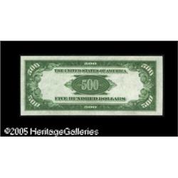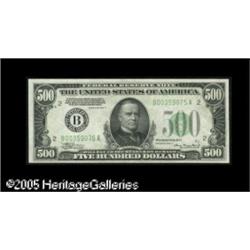<B>Fr. 2202-B $500 1934A Federal Reserve Note. Mule. Choice Crisp Uncirculated.</B></I><BR>Original paper surfaces enhance this fresh note, which misses the Gem designation due to a light counting wrinkle at right. Lot:16520