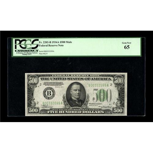 <B>Fr. 2202-B $500 1934A Federal Reserve Note. PCGS Gem New 65.</B></I><BR>The centering is quite pleasing on this New York high denomination.<BR><BR><b>Shipping:</b> Coins & Currency (<a target="_blank" href="http://www.heritageauctions.com/common/shipping.php">view shipping information</a>)