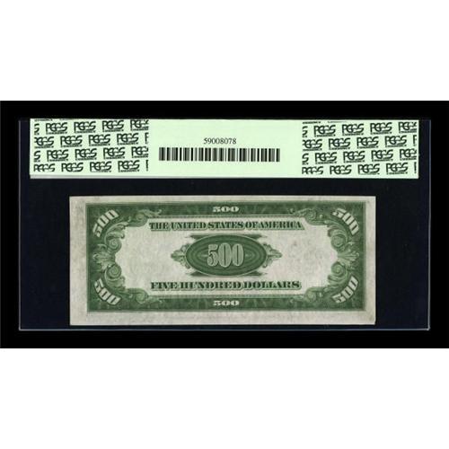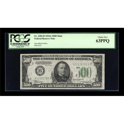 <B>Fr. 2202-B $500 1934A Federal Reserve Note. PCGS Choice New 63PPQ.</B></I><BR> Bold embossing of the serial numbers and seal are noted when viewed from the back. A touch of handling is noted on this issue which boasts Gem sized margins and eye appeal.<BR><BR><b>Shipping:</b> Coins & Currency (<a target="_blank" href="http://www.heritageauctions.com/common/shipping.php">view shipping information</a>)