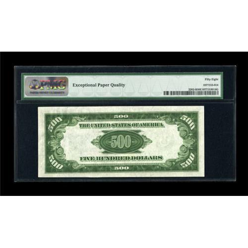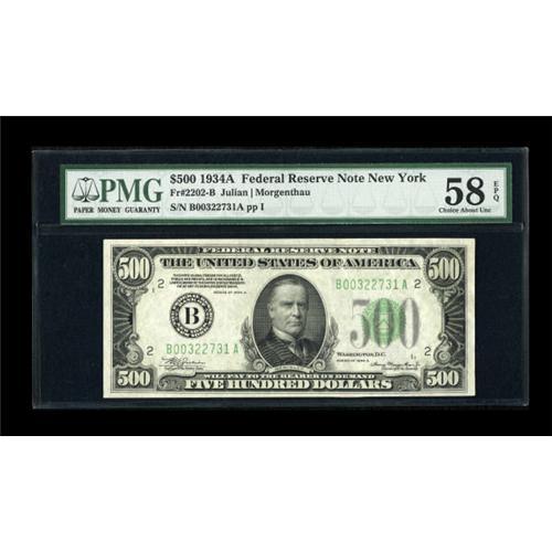 <B>Fr. 2202-B $500 1934A Federal Reserve Note. PMG Choice About Unc 58 EPQ.</B></I><BR> The second note from the New York run up for auction here. A corner fold into the design is noticed.<BR><BR><b>Shipping:</b> Coins & Currency (<a target="_blank" href="http://www.heritageauctions.com/common/shipping.php">view shipping information</a>)