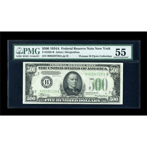 <B>Fr. 2202-B $500 1934A Federal Reserve Note. PMG About Uncirculated 55.</B></I><BR> A bright and well centered $500 which appears uncirculated in its third party holder. <BR><I>From The Thomas M. Flynn Collection</B></I><BR><BR><b>Shipping:</b> Coins & Currency (<a target="_blank" href="http://www.heritageauctions.com/common/shipping.php">view shipping information</a>)
