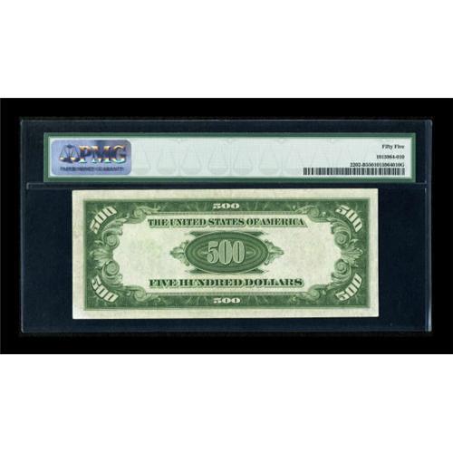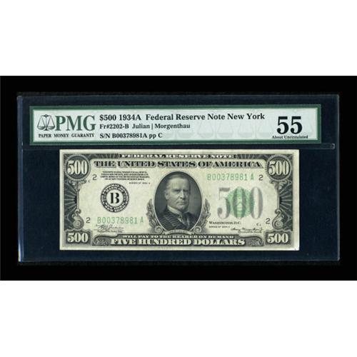 <B>Fr. 2202-B $500 1934A Federal Reserve Note. PMG About Uncirculated 55.</B></I><BR> No single fold is visible in the holders, though we suspect the folds may only be corner tip folds.<BR><BR><b>Shipping:</b> Coins & Currency (<a target="_blank" href="http://www.heritageauctions.com/common/shipping.php">view shipping information</a>)