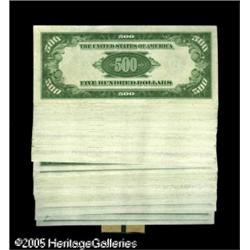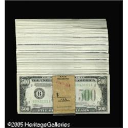 <B>Fr. 2202-B $500 1934A Federal Reserve Notes. Crisp Uncirculated-Choice Crisp Uncirculated.</B></I><BR>One of the highlights of the Taylor Family collection, as this is the only known original pack of 100 $500 notes extant. Its offering here represents the first time it has been offered publicly to the numismatic fraternity. Most all of the notes are well centered examples which are pack fresh, although virtually all display considerable counting soil. The vast majority also have a handling mark at the upper right, as well as the occasional bend developed during years of storage. The first few notes display the most evidence of handling, along with several pieces in the middle of the pack. In fact, the top note has an approximate quarter inch tear below the portrait. The band which accompanies these notes could well be original to the pack as well. Any estimate here is just a guess, because of the unusual nature of this grouping, but a likely realization for this almost certainly unique item is... 100 notes Lot:16521