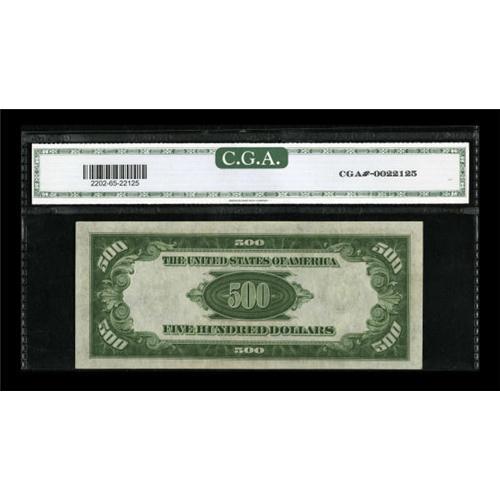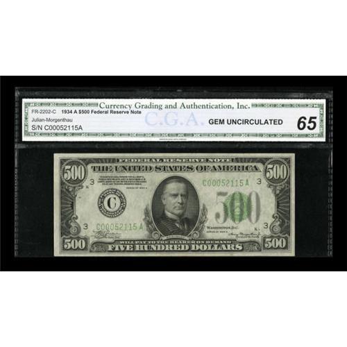 <B>Fr. 2202-C $500 1934A Federal Reserve Note. CGA Gem Uncirculated 65.</B></I><BR> This is a strongly embossed Philly note that has decent eye appeal.<BR><BR><b>Shipping:</b> Coins & Currency (<a target="_blank" href="http://www.heritageauctions.com/common/shipping.php">view shipping information</a>)