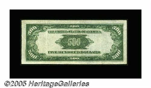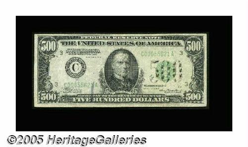 <B>Fr. 2202-C $500 1934A Federal Reserve Note. Very Fine.</B></I><BR>Only 45,300 notes were printed from here in this series and denomination. This example, with a trivial bank stamp remnant on the face, will likely sell for about...