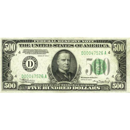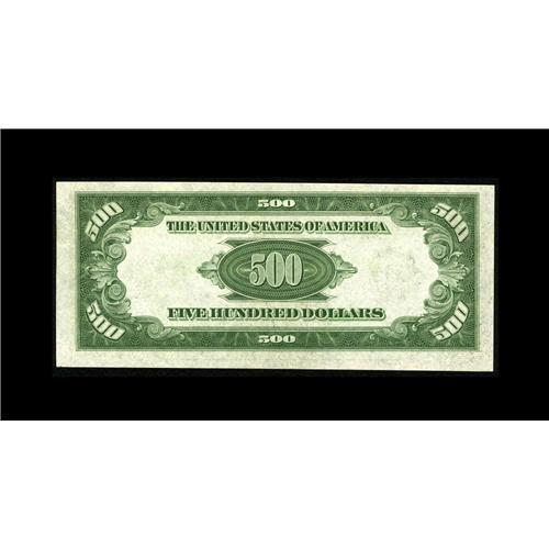 <B>Fr. 2202-D $500 1934A Federal Reserve Note. Choice About Uncirculated.</B></I><BR>We are sorely tempted to label this high denomination example as Choice Crisp Uncirculated, as the handling present here is truly minor and the one fold observed is barely visible.