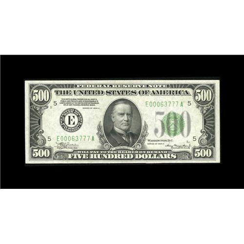 <B>Fr. 2202-E $500 1934A Federal Reserve Note. Gem Crisp Uncirculated.</B></I><BR>A perfectly centered example from this considerably scarcer district. Unusually for this issue, the embossing is plainly evident.
