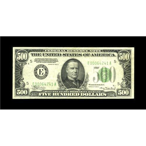 <B>Fr. 2202-E $500 1934A Federal Reserve Note. Very Fine-Extremely Fine.</B></I><BR>Richmond is a tougher district for $500s. Traces of embossing remain on this example.<BR><BR><b>Shipping:</b> Coin/Currency (<a target="_blank" href="http://www.heritageauctions.com/common/shipping.php">view shipping information</a>)