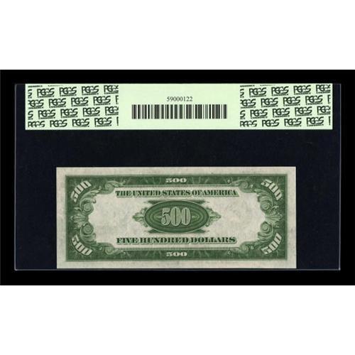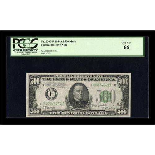 <B>Fr. 2202-F $500 1934A Federal Reserve Note. PCGS Gem New 66.</B></I><BR> Broad margins surround this well preserved $500 that is a condition census third-party graded note for this Friedberg number. Expect a flurry of bidding activity on this lot as knowledgeable collectors realize the registry set potential of this beauty.<BR><BR><b>Shipping:</b> Coins & Currency (<a target="_blank" href="http://www.heritageauctions.com/common/shipping.php">view shipping information</a>)
