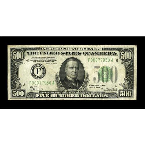<B>Fr. 2202-F $500 1934A Federal Reserve Note. Very Fine-Extremely Fine.</B></I><BR>This is a decent $500 note that is still crisp with a trace of a stray mark on the face likely to realize...<BR><BR><b>Shipping:</b> Coin/Currency (<a target="_blank" href="http://www.heritageauctions.com/common/shipping.php">view shipping information</a>)