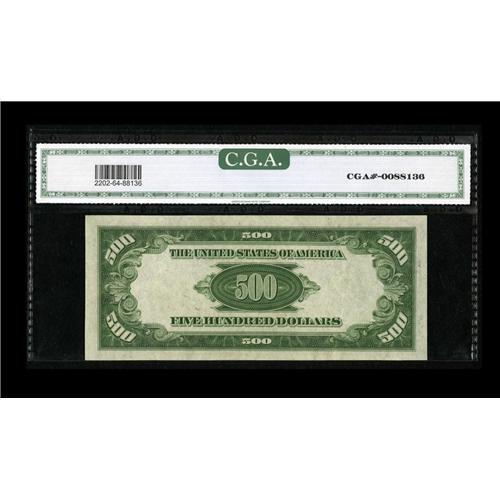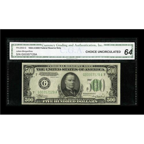 <B>Fr. 2202-G $500 1934A Federal Reserve Note. CGA Choice Uncirculated 64.</B></I><BR>A bright Chicago example that is nicely centered on the back.