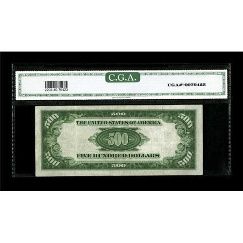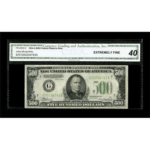 <B>Fr. 2202-G $500 1934A Federal Reserve Note. CGA Extremely Fine 40.</B></I><BR> Three vertical folds and a horizontal fold account for the grade on this Chicago $500.<BR><BR><b>Shipping:</b> Coins & Currency (<a target="_blank" href="http://www.heritageauctions.com/common/shipping.php">view shipping information</a>)