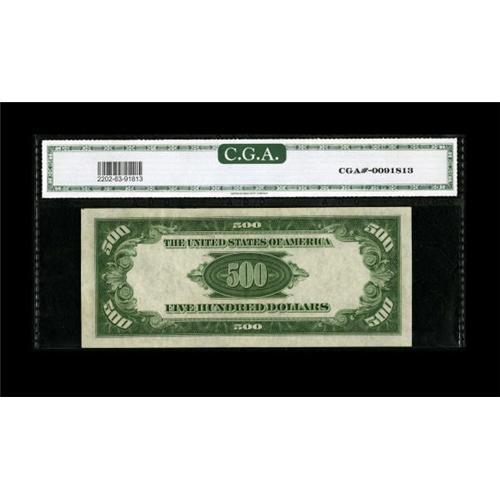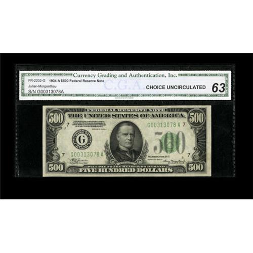 <B>Fr. 2202-G $500 1934A Federal Reserve Note. CGA Choice Uncirculated 63.</B></I><BR> Good color remains along with decent margins for the grade assigned. Some embossing is also noticed beneath the third party holder.<BR><BR><b>Shipping:</b> Coins & Currency (<a target="_blank" href="http://www.heritageauctions.com/common/shipping.php">view shipping information</a>)