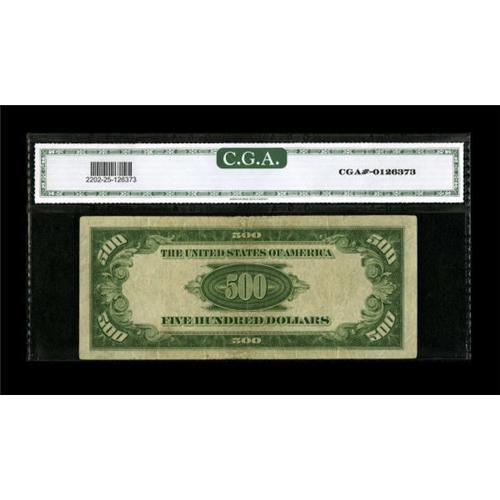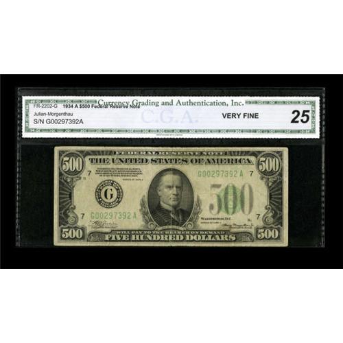 <B>Fr. 2202-G $500 1934A Federal Reserve Note. CGA Very Fine 25.</B></I><BR> A nice, evenly circulated note which CGA has graded Very Fine 25. <BR><BR><b>Shipping:</b> Coins & Currency (<a target="_blank" href="http://www.heritageauctions.com/common/shipping.php">view shipping information</a>)