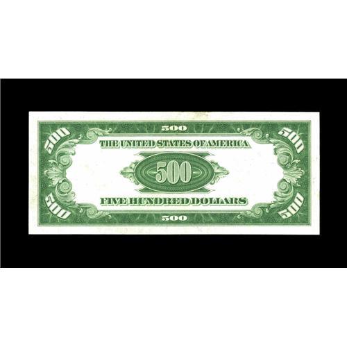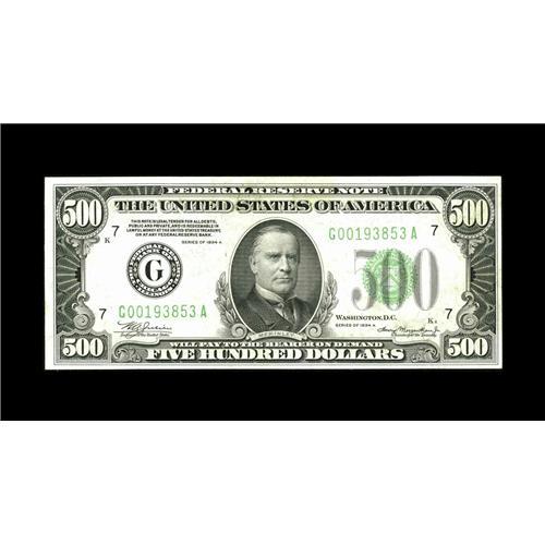 <B>Fr. 2202-G $500 1934A Federal Reserve Note. Choice About Uncirculated.</B></I><BR>A light fold is observed.