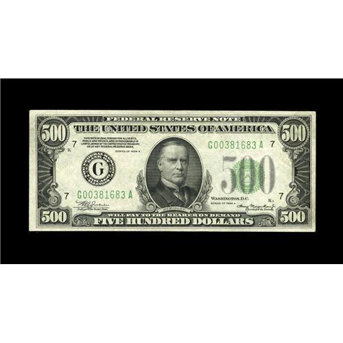 <B>Fr. 2202-G $500 1934A Federal Reserve Note. Choice About Uncirculated.</B></I><BR>A touch of handling and a light center bend account for the grade on this otherwise very pleasing and original issue.