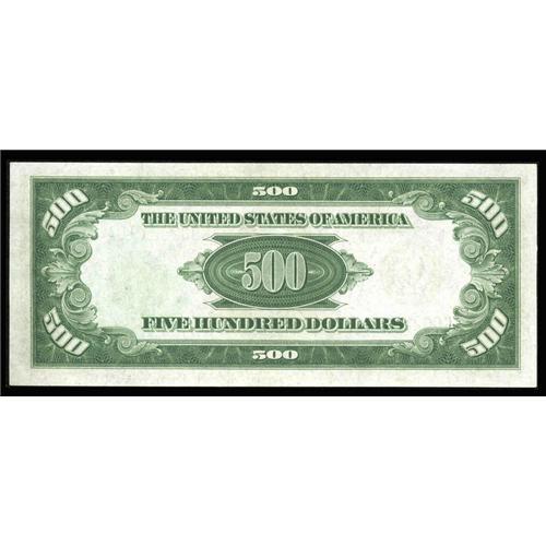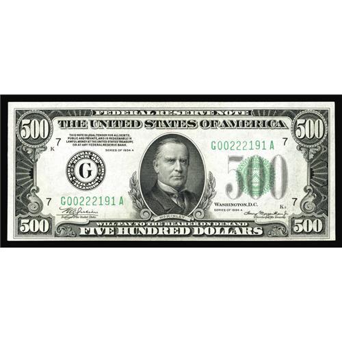 <B>Fr. 2202-G $500 1934A Federal Reserve Note. Choice Crisp Uncirculated.</B></I><BR>Bright and well printed, with the bottom margin just a bit close.