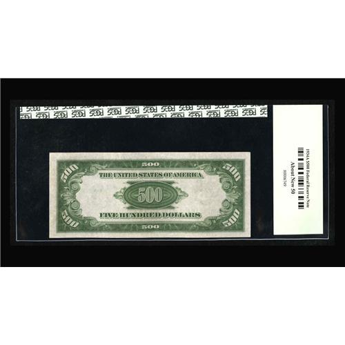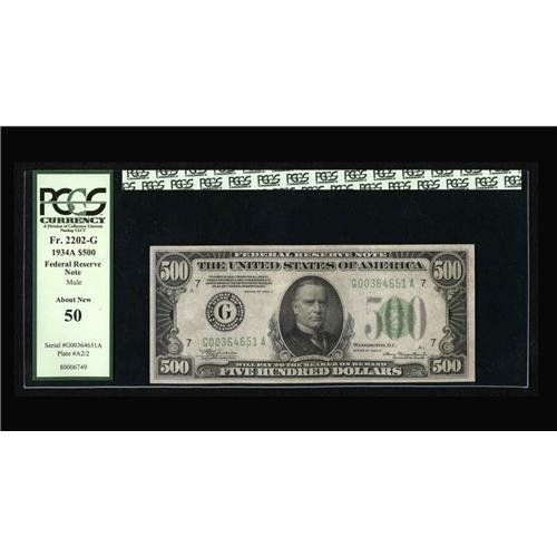 <B>Fr. 2202-G $500 1934A Federal Reserve Note. PCGS About New 50.</B></I><BR>A most attractive example certified as About New 50 by PCGS.