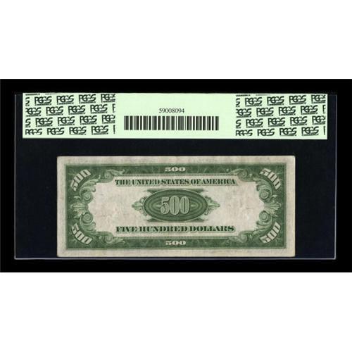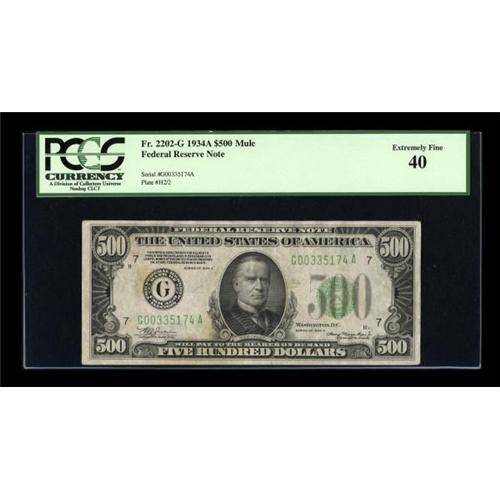 <B>Fr. 2202-G $500 1934A Federal Reserve Note. PCGS Extremely Fine 40.</B></I><BR> Pleasing, original paper is noted on this lightly circulated issue.<BR><BR><b>Shipping:</b> Coins & Currency (<a target="_blank" href="http://www.heritageauctions.com/common/shipping.php">view shipping information</a>)
