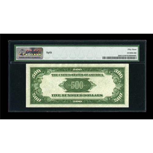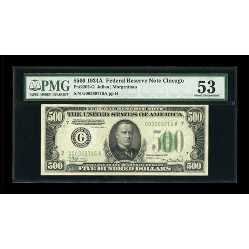 <B>Fr. 2202-G $500 1934A Federal Reserve Note. PMG About Uncirculated 53.</B></I><BR> A diagonal corner fold is noticed at left on nicely margined note. <BR><BR><b>Shipping:</b> Coins & Currency (<a target="_blank" href="http://www.heritageauctions.com/common/shipping.php">view shipping information</a>)