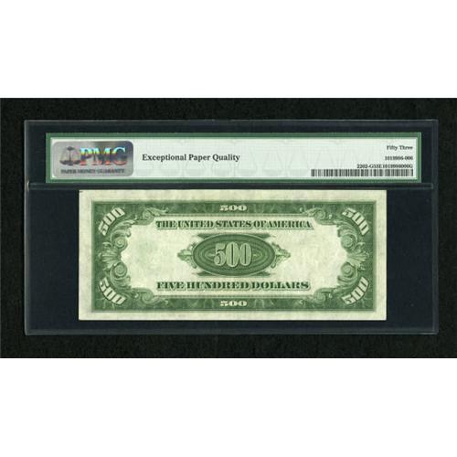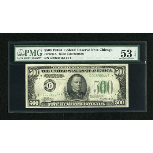 <B>Fr. 2202-G $500 1934A Federal Reserve Note. PMG About Uncirculated 53 EPQ.</B></I><BR> A pleasing original, problem free high denomination that exhibits plenty of embossing.<BR><BR><b>Shipping:</b> Coins & Currency (<a target="_blank" href="http://www.heritageauctions.com/common/shipping.php">view shipping information</a>)