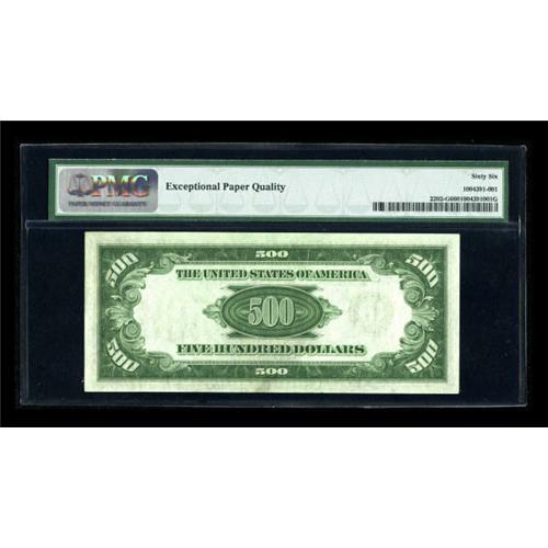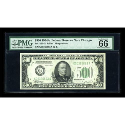 <B>Fr. 2202-G $500 1934A Federal Reserve Note. PMG Gem Uncirculated 66 EPQ.</B></I><BR> This pleasing, well margined note displays original unmolested surfaces.<BR><BR><b>Shipping:</b> Coins & Currency (<a target="_blank" href="http://www.heritageauctions.com/common/shipping.php">view shipping information</a>)