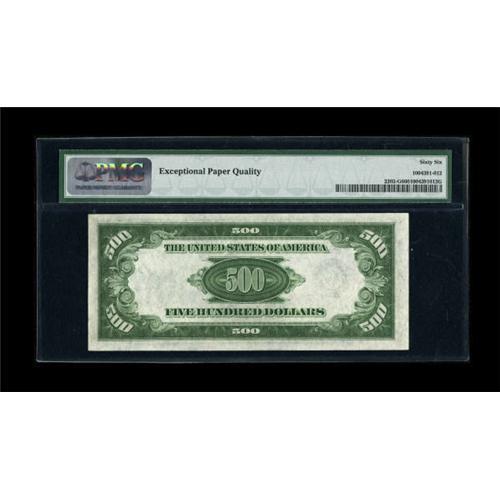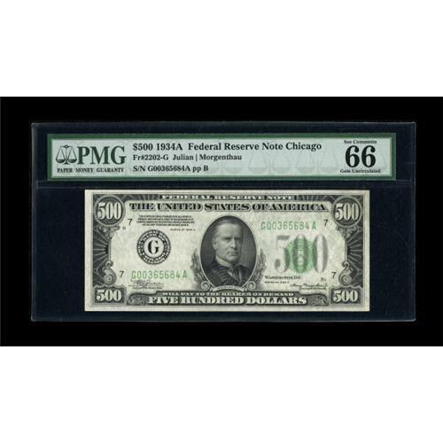 <B>Fr. 2202-G $500 1934A Federal Reserve Note. PMG Gem Uncirculated 66 EPQ.</B></I><BR> This is a wonderfully well margined example from the Chicago district that comes from a small cache of notes offered here. A common district in a not so common grade.<BR><BR><b>Shipping:</b> Coins & Currency (<a target="_blank" href="http://www.heritageauctions.com/common/shipping.php">view shipping information</a>)