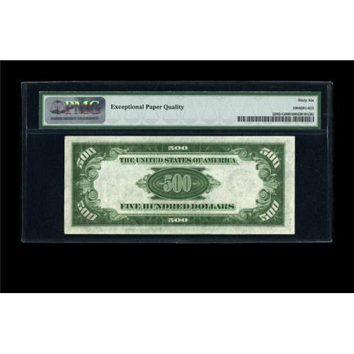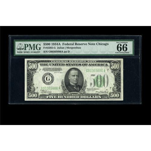 <B>Fr. 2202-G $500 1934A Federal Reserve Note. PMG Gem Uncirculated 66 EPQ.</B></I><BR> This is another nicely preserved example in a grade seldom achieved by high denomination notes. The colors are vivid with pleasing overall eye appeal.<BR><BR><b>Shipping:</b> Coins & Currency (<a target="_blank" href="http://www.heritageauctions.com/common/shipping.php">view shipping information</a>)