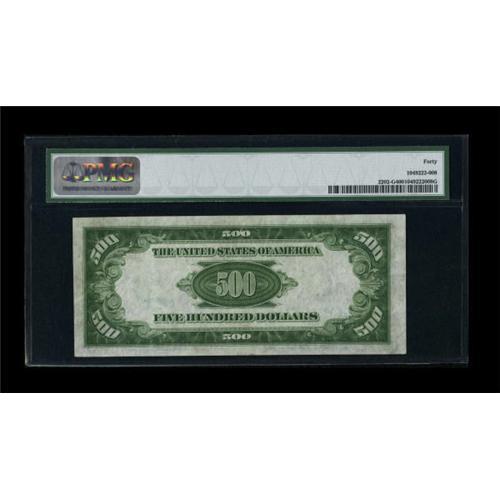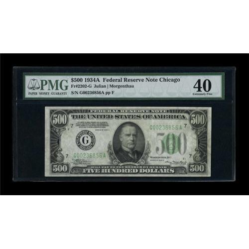 <B>Fr. 2202-G $500 1934A Federal Reserve Note. PMG Extremely Fine 40.</B></I><BR> Hints of embossing remain on this nicely margined Chicago example.<BR><BR><b>Shipping:</b> Coins & Currency (<a target="_blank" href="http://www.heritageauctions.com/common/shipping.php">view shipping information</a>)