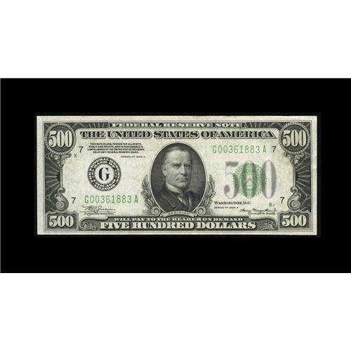 <B>Fr. 2202-G $500 1934A Federal Reserve Note. Very Choice Crisp Uncirculated.</B></I><BR>Part of the run of nine consecutive Chicago examples, and just a tiny handling mark from Gem.