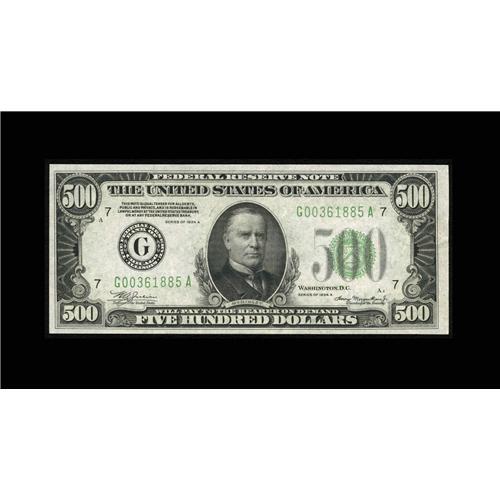 <B>Fr. 2202-G $500 1934A Federal Reserve Note. Very Choice Crisp Uncirculated.</B></I><BR>Another from the consecutive run. With a tiny bit better centering, this piece would easily make the gem class.