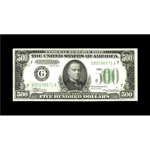 <B>Fr. 2202-G $500 1934A Federal Reserve Note. Very Fine.</B></I><BR>An internal split was repaired with exceptional precision.