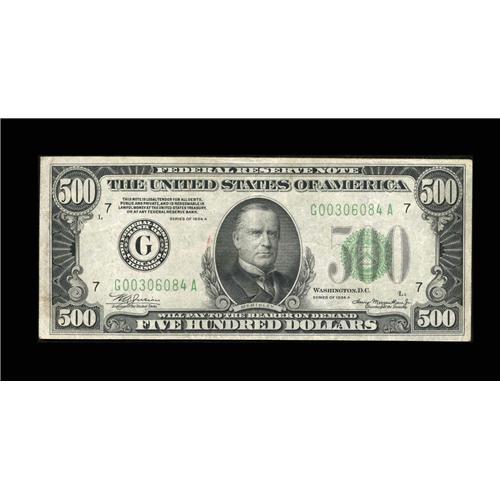 <B>Fr. 2202-G $500 1934A Federal Reserve Note. Very Fine-Extremely Fine.</B></I><BR>A bit of light red teller stamp detracts little from this Chicago example which has solid margins and snappy paper.
