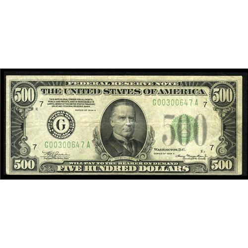 <B>Fr. 2202-G $500 1934A Federal Reserve Note. Very Fine.</B></I><BR>Problem free, but the bottom margin is a touch close.