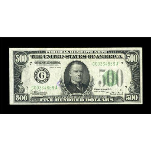 <B>Fr. 2202-G $500 1934A Federal Reserve Note. Very Fine.</B></I><BR> An evenly circulated piece with a small split at the top and a couple of pinholes. A tiny area of bank stamp affects little. <BR><BR><b>Shipping:</b> Coins & Currency (<a target="_blank" href="http://www.heritageauctions.com/common/shipping.php">view shipping information</a>)