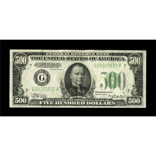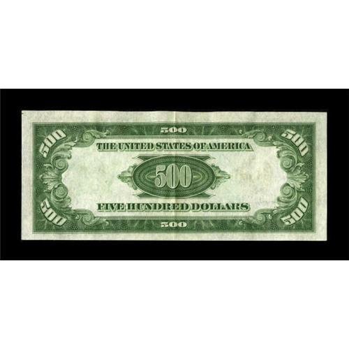 <B>Fr. 2202-G $500 1934A Federal Reserve Note. Choice About Uncirculated.</B></I><BR> A hard center fold is the only sign this bright note ever entered circulation.<BR><BR><b>Shipping:</b> Coins & Currency (<a target="_blank" href="http://www.heritageauctions.com/common/shipping.php">view shipping information</a>)