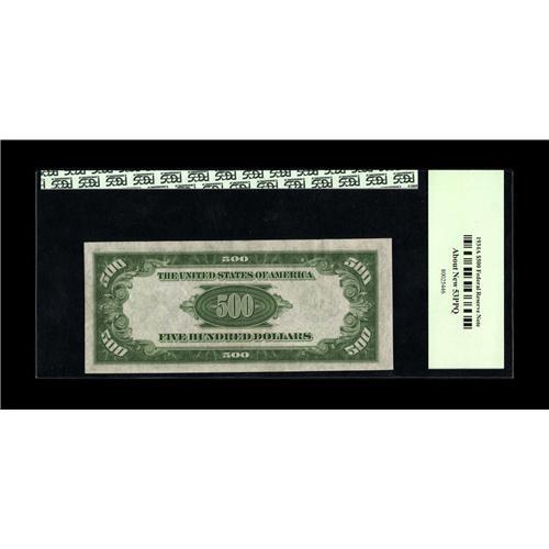 <B>Fr. 2202-G $500 1934A Mule Federal Reserve Note. PCGS About New 53PPQ.</B></I><BR>This is a most attractive example with deep inks.<BR><BR><b>Shipping:</b> Coin/Currency (<a target="_blank" href="http://www.heritageauctions.com/common/shipping.php">view shipping information</a>)