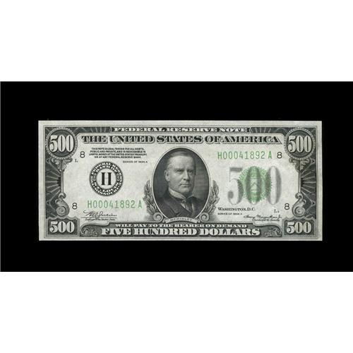 <B>Fr. 2202-H $500 1934A Federal Reserve Note. Choice Crisp Uncirculated.</B></I><BR>A well embossed, attractive St. Louis district example with just a bit of handling evident.<BR><I>From The Ron W. Keeney Collection</B></I>