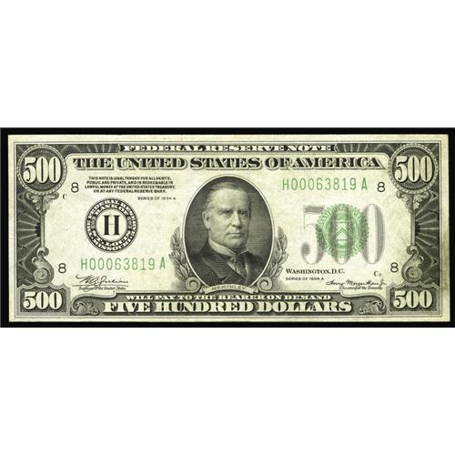 <B>Fr. 2202-H $500 1934A Federal Reserve Note. Extremely Fine-About Uncirculated.</B></I><BR>Nicely centered and with very little evidence of real circulation.