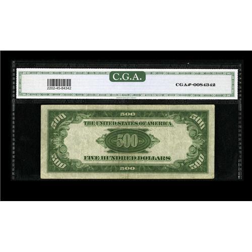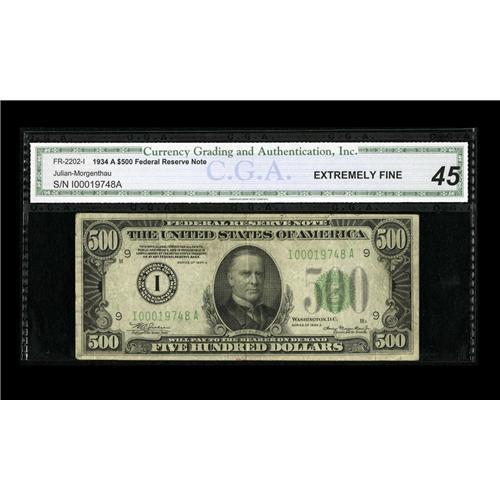 <B>Fr. 2202-I $500 1934A Federal Reserve Note. CGA Extremely Fine 45.</B></I><BR>The minor folds may be too numerous for a full XF, though the originality may boost the grade.