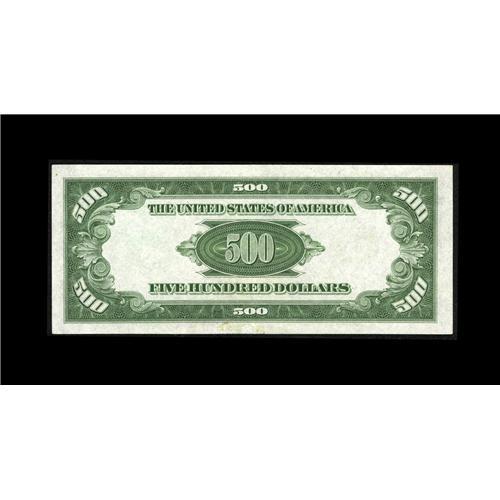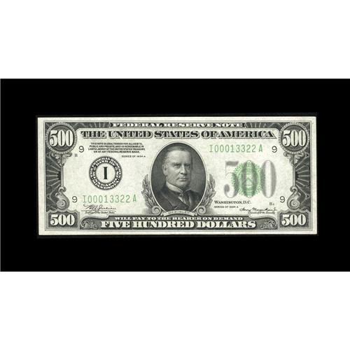 <B>Fr. 2202-I $500 1934A Federal Reserve Note. Choice Crisp Uncirculated.</B></I><BR>A very scarce note from the district with by far the lowest printing in this series. Expect to see bidding easily reach or exceed...