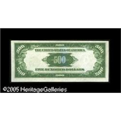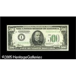 <B>Fr. 2202-I $500 1934A Federal Reserve Note. Mule. About Uncirculated.</B></I><BR>Well centered and without any visible folds, but the paper surfaces give indications of the application of external pressure and there is a light area of blue discoloration on the back. Lot:16533