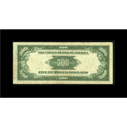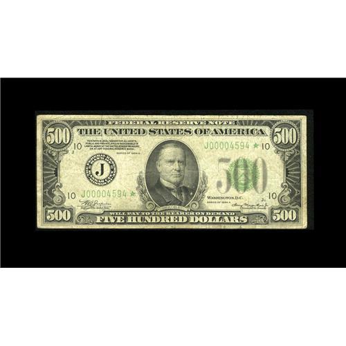 <B>Fr. 2202-J* $500 1934A Federal Reserve Note. About Fine.</B></I><BR>A well circulated but fully intact high denomination star which offers good color and body despite its high degree of circulation. Expect this piece, which is new to the census, to reach or exceed...