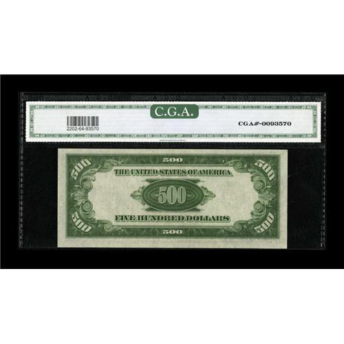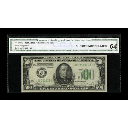 <B>Fr. 2202-J $500 1934A Federal Reserve Note. CGA Choice Uncirculated 64.</B></I><BR>Nice margins and embossing are highlights of this $500.<BR><BR><b>Shipping:</b> Coins & Currency (<a target="_blank" href="http://www.heritageauctions.com/common/shipping.php">view shipping information</a>)