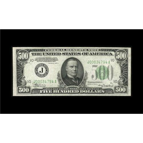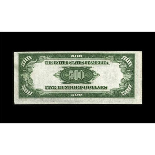 <B>Fr. 2202-J $500 1934A Federal Reserve Note. Crisp Uncirculated.</B></I><BR>This crisp example that remains quite bright has a slightly skewed reverse keeping it from a higher grade.